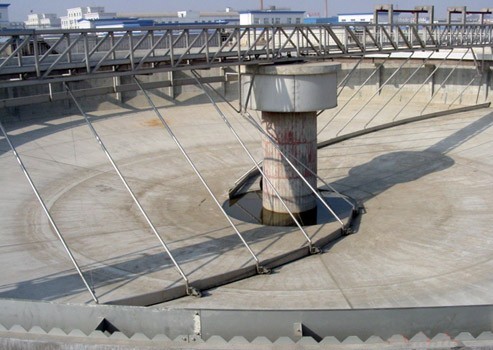 原水從池底經(jīng)中心支墩上部流出,并經(jīng)導(dǎo)流筒配水后,呈輻射流向池子周邊集水槽出水,隨著輻向流速的降低,原水中的懸浮物被分離而沉降于池底。旋轉(zhuǎn)桁架以中心支承為圓心,端部走輪在驅(qū)動(dòng)裝置的作用下,沿池周軌道回轉(zhuǎn)運(yùn)行,帶動(dòng)下部近似對(duì)數(shù)螺旋線運(yùn)行軌跡的刮泥板緩慢轉(zhuǎn)動(dòng),刮集至沉淀池中心集泥槽,依靠水壓或泵排出池外,上部浮渣由刮渣板同步刮至排渣斗排出。